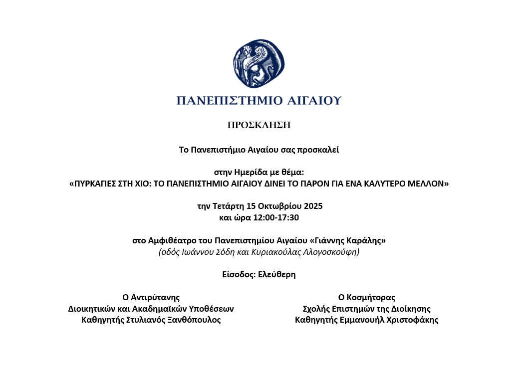 Το Πανεπιστήμιο Αιγαίου αναλογιζόμενο την τεράστια ζημιά που προκάλεσαν, για ακόμα μια φορά, οι πρόσφατες καταστροφικές πυρκαγιές στη Χίο, διοργανώνει ενημερωτική - επιστημονική ημερίδα με τίτλο «Πυρκαγιές στη Χίο: Το Πανεπιστήμιο Αιγαίου δίνει το παρόν για ένα καλύτερο μέλλον».